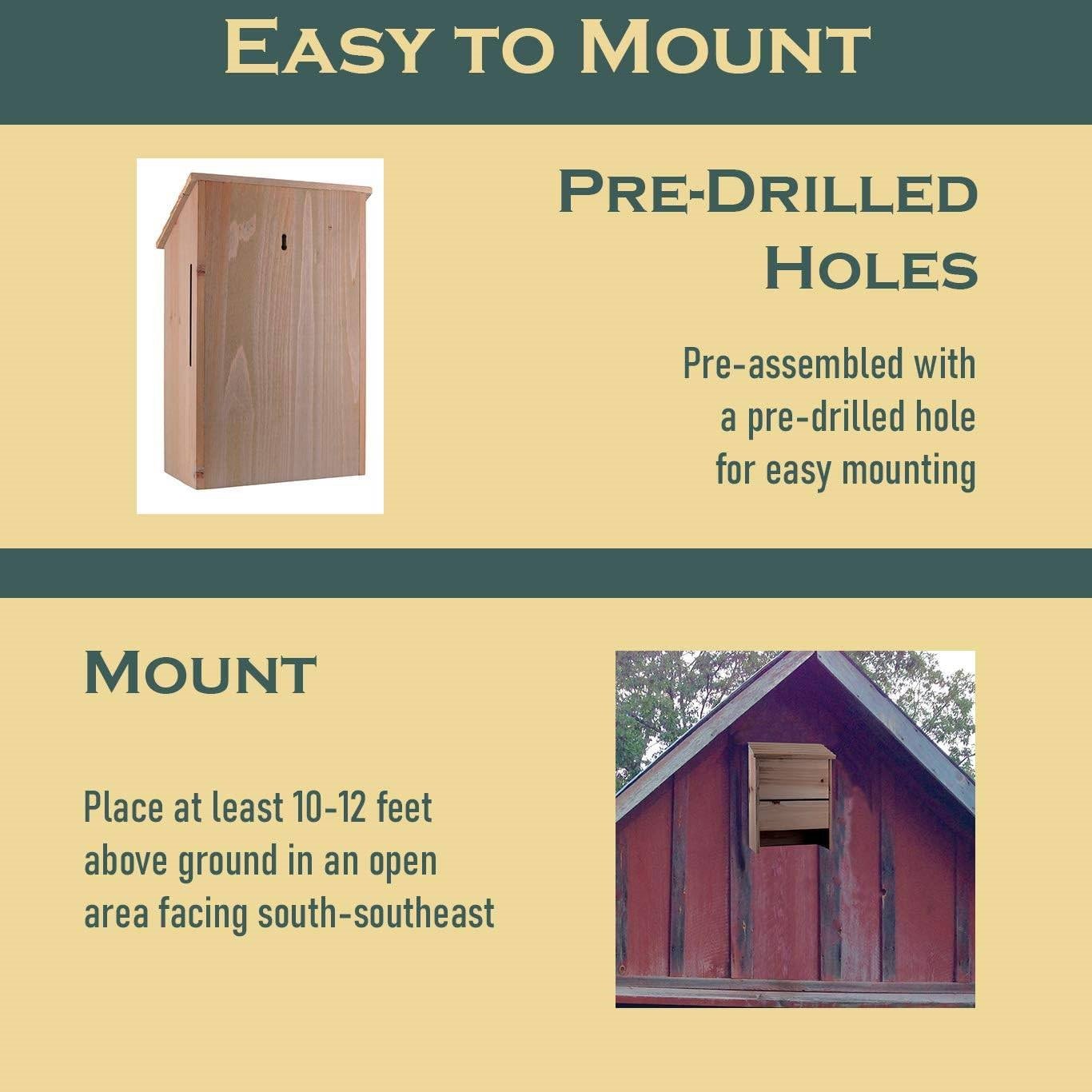 • EASY TO INSTALL: Pre-assembled bat house comes ready to mount. Pre-drilled holes on the back panel for attaching to poles, trees or buildings.